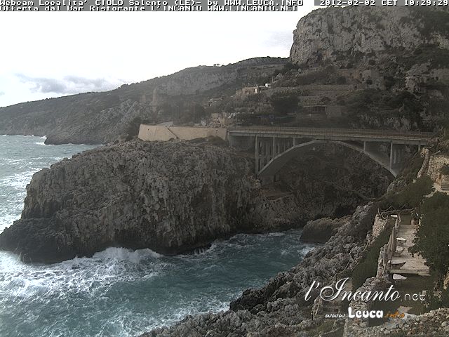 La Webcam del Ciolo è offerta da “Bar Ristorante L’Incanto” in collaborazione con Leuca.info posizionata presso il ristorante vicino al ponte, nel comune di Gagliano del Capo, ancora regalala i live più spettacolari in assoluto.